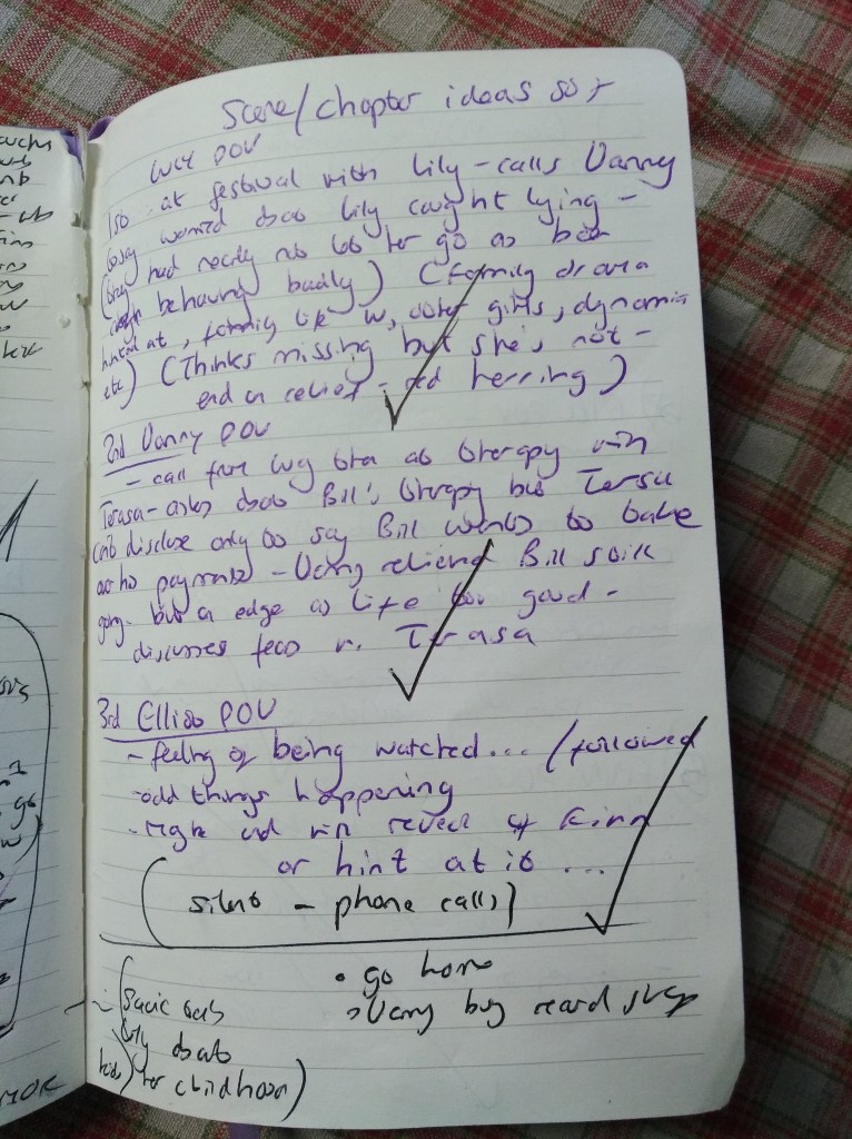 Step 2: The next thing that happens is an ideas explosion. Mind-maps or brainstorms are good too, but I like to just list my ideas and then later when chapters are being written I have the satisfying job of going back and ticking off what I’ve done. These ideas won’t be in order, by the way. And a lot of them won’t make it into the book. New ideas and sub-plots will inevitably muscle their way in too.