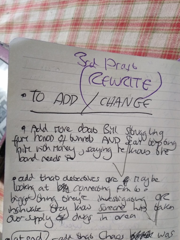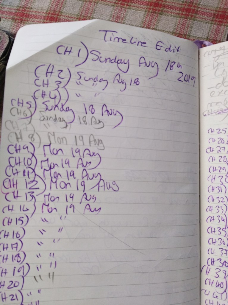 Step 6. The book is now written in the first draft. I go back to the start and read through and at the same time I make note of a timeline in the notebook. I should do this when I am writing the first draft but I nearly always neglect to. For me, the purpose of a second draft is to read through what just happened, as I often don’t remember, and to apply the timeline so there are no date based plot holes or inconsistencies. I will also make changes and amend typos etc if I see them.